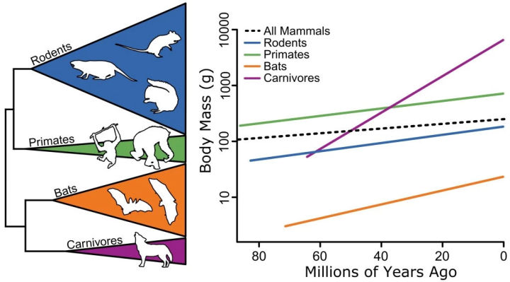 比如恐龍的體型不斷變大,而哺乳動(dòng)物的體型也不斷變大,但更晚繁榮的哺乳動(dòng)物不一定會(huì)比更早出現(xiàn)的恐龍大。