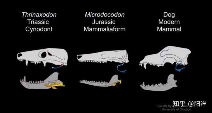 除了微小柱齒獸外,另一項(xiàng)重大發(fā)現(xiàn)是遼寧的蓋氏熱河俊獸,微小柱齒獸透露了舌骨演化的秘密,蓋氏熱河俊獸則是保存了聽(tīng)骨演化的關(guān)鍵,哺乳類以外的其他脊椎動(dòng)物類群如兩棲類、爬行類、鳥(niǎo)類只有一塊聽(tīng)小骨,而哺乳類的聽(tīng)骨卻由錘骨、砧骨及鐙骨組成,更復(fù)雜的聽(tīng)骨結(jié)構(gòu)帶來(lái)了優(yōu)良的傳導(dǎo)效果也使哺乳類擁有了更好的聽(tīng)力,那么哺乳類多出的兩塊聽(tīng)骨是哪來(lái)的呢?答案是下頜,其實(shí)這兩塊聽(tīng)骨最初是原始下頜關(guān)節(jié)的一部分,相當(dāng)于爬行類的方骨和關(guān)節(jié)骨,只是在哺乳類的進(jìn)化過(guò)程中轉(zhuǎn)移到了中耳成為了聽(tīng)覺(jué)系統(tǒng)的一部分。