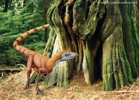 這只世界上所發(fā)現(xiàn)的第一只長有絨狀細(xì)毛的恐龍,被命名為原始中華龍鳥,是一種介于恐龍與鳥類之間的過渡型生物,可能代表了鳥類起源和演化的祖先類型。它擁有一個大頭顱,樣子與雞相近,前肢短小,后肢長而粗壯;嘴里的銳利牙齒,說明它是一只活躍的掠食者。除了長毛以外,它那條由多達(dá)58節(jié)尾椎骨所組成的特長尾巴,也是一個重要的特征。它生活在中國的白堊紀(jì)早期,以蜥蜴為生。