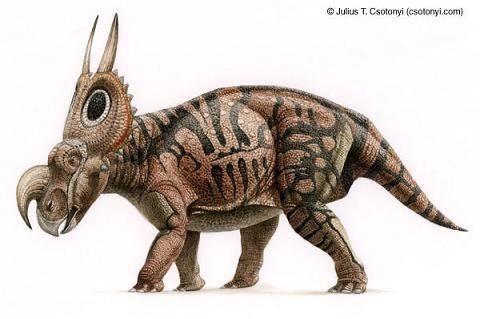 野牛龍生活在白堊紀(jì)晚期,大約6 米長、1米高,頭部有三只大角,脖子上有一個大頸盾,邊緣有齒狀骨質(zhì)突起。它是由山普森(Sampson)在1994年發(fā)現(xiàn)的三個頭骨化石命名的。像其它角龍一樣,它在獸群中穿行,有牙齒,能咀嚼最硬的植物。