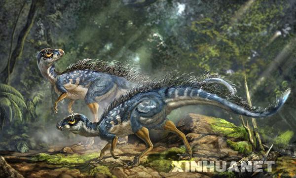 中國(guó)科學(xué)家在遼西發(fā)現(xiàn)了一種“帶有最原始羽毛的恐龍”——孔子天宇龍。這一恐龍新屬種的發(fā)現(xiàn)不僅將異齒龍類恐龍的分布擴(kuò)展至亞洲,而且填補(bǔ)了羽毛早期演化中的一個(gè)空白。圖為孔子天宇龍復(fù)原圖。