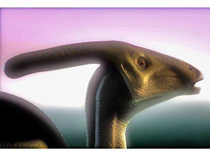 鴨嘴龍科的頭上都有一塊形狀怪異的隆起,其中又以副櫛龍最顯眼。有人說那塊怪異的隆起是可以在水中呼吸的氣官,不過我認(rèn)為應(yīng)該是互相傳音的共鳴室吧!在鴨嘴龍類當(dāng)中,既有光頭的,也有載帽的。副櫛龍就是一種戴帽的恐龍,它的頭冠長在鼻骨上,充滿了通道??諝鈴谋强孜?,經(jīng)過這些通道才能到達(dá)肺部。這些通道是這類恐龍的發(fā)聲器,就像圓號中彎曲的管子。副櫛龍的身體上有典型陷處,剛好可以把長長的頭冠的頂端擱在上面,就像隨身帶著掛物架一樣。